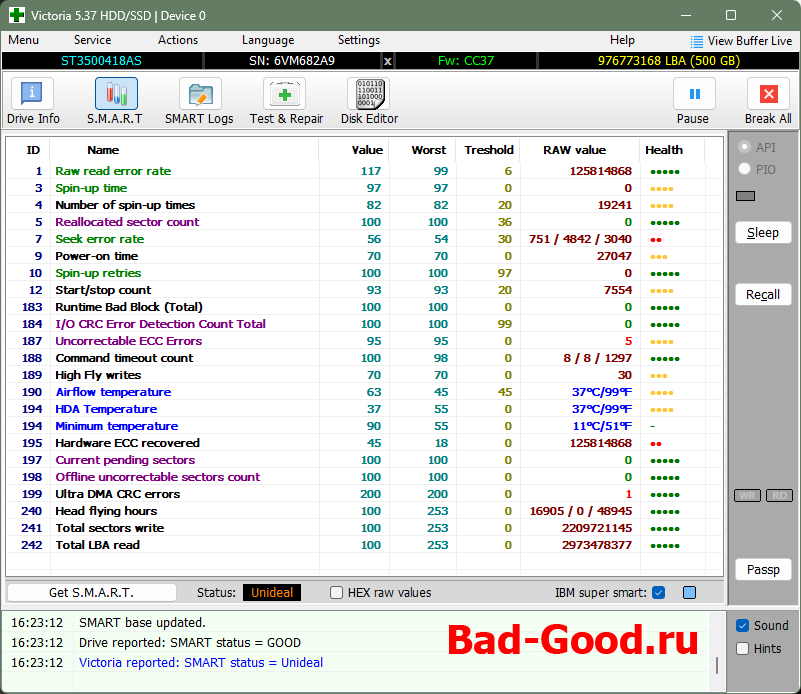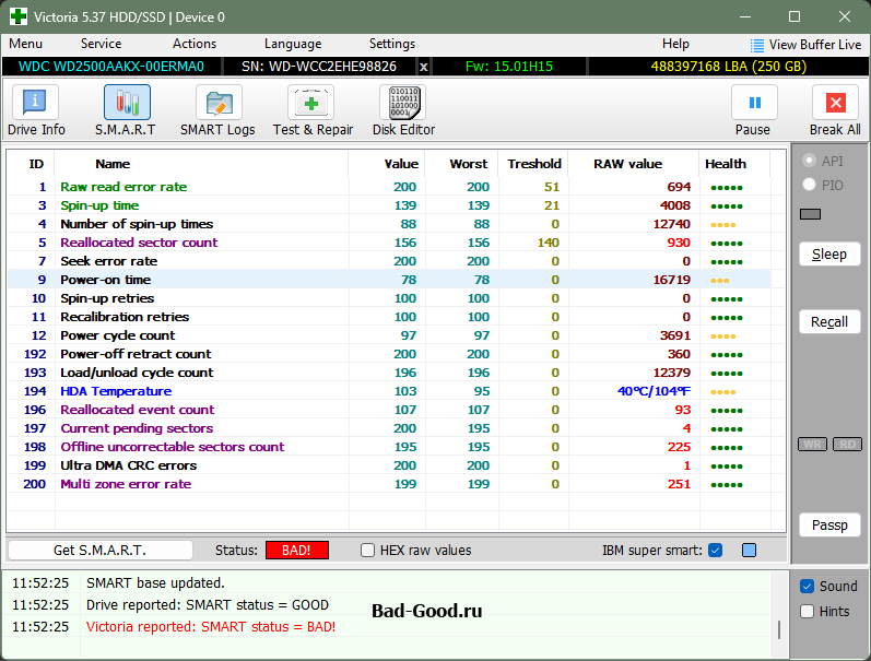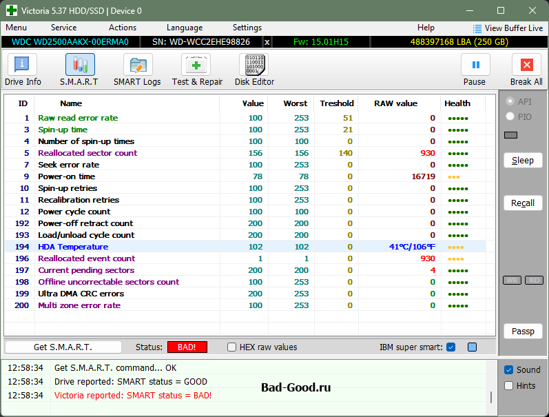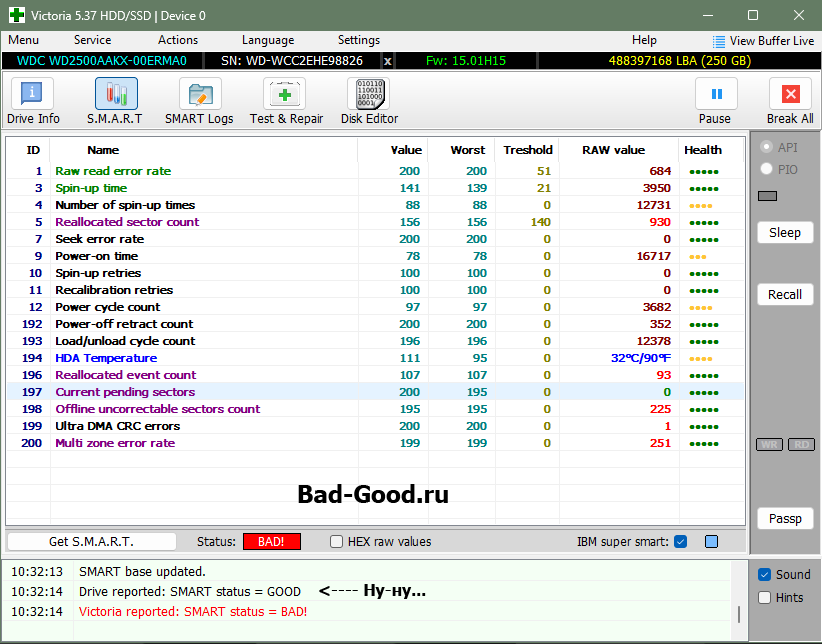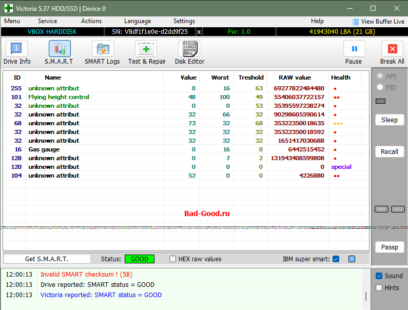 По ATA пытался зачистить информацию о наличии BAD-секторов - неудача (нужно было выбирать режим WinAPI по умолчанию - принудительно оборвал процесс после долгого ожидания). Это привело к тому, что S.M.A.R.T. вообще полностью очистился, - и Victoria считала его как "GOOD" (нет негативных критических чисел - нет проблемы). Цель доказать, что S.M.A.R.T. может изменить даже ребёнок, - достигнута (жаль, рисунок этого треша не сохранился).