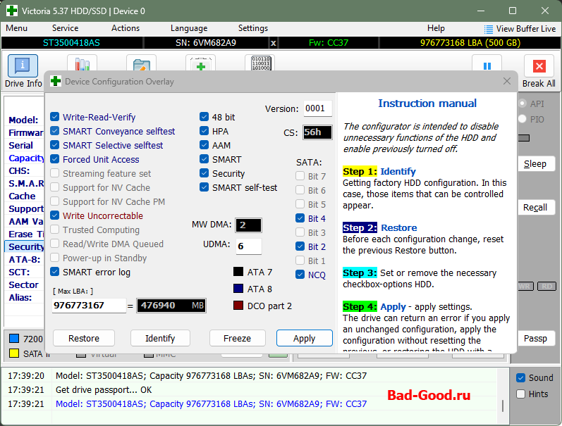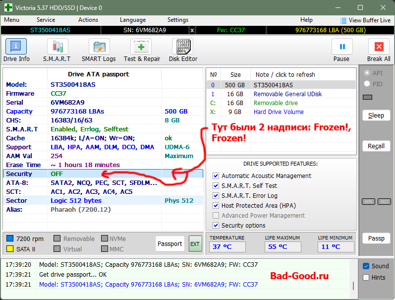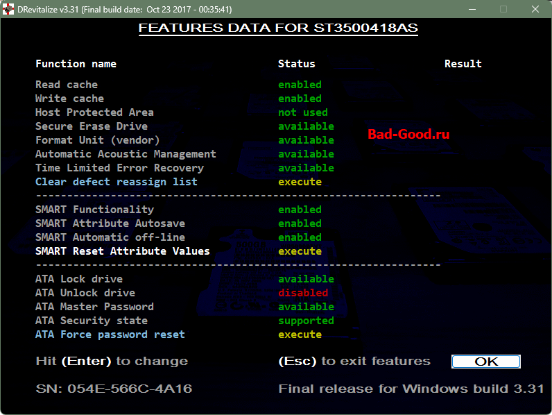 Повторяем очистку BAD-ов, но уже через WinAPI. Параллельно замечаем опцию, что пароль с HDD можно снять. Опять очень долгое время ожидания, опять принудительная отмена - и опять тот же результат (как мем Олега Тинькова в 3 картинках). Разозлился и выбрал опцию зачистить весь S.M.A.R.T. Отработала секунд за 5 - почти все параметры обнулились.