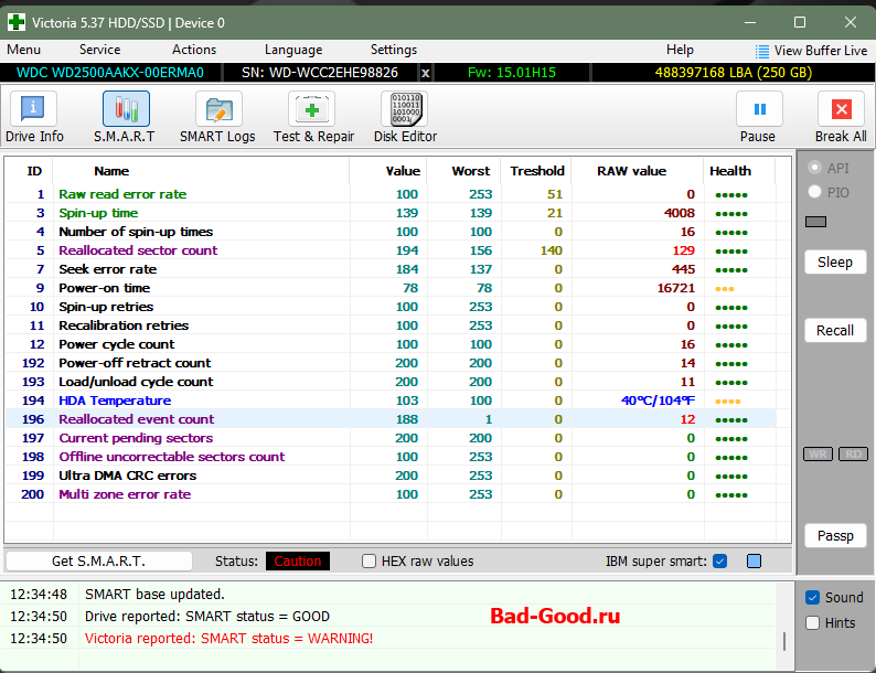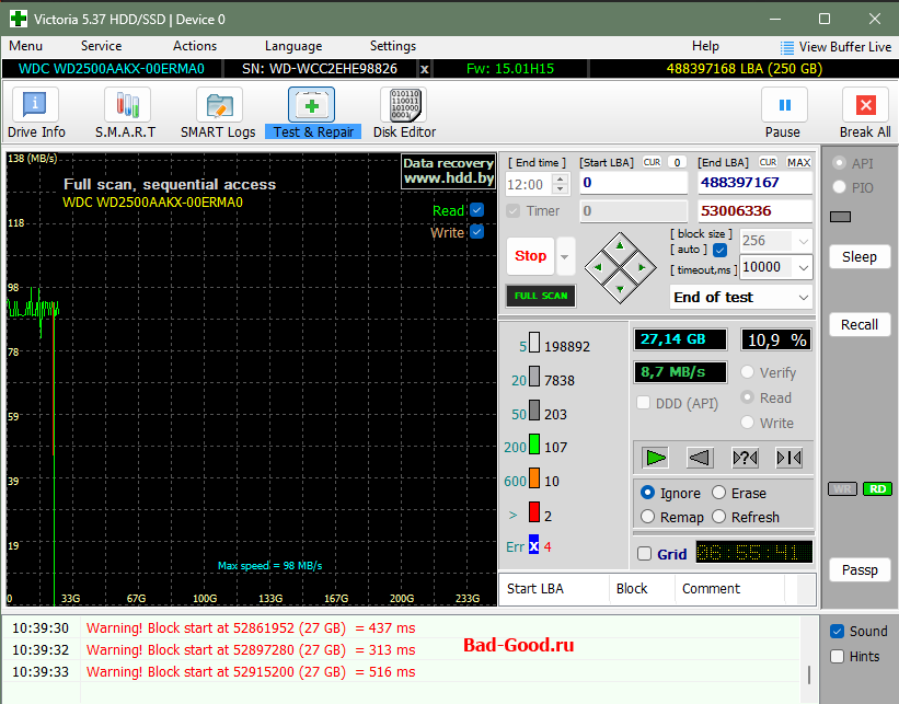 HDD Western Digital WD2500AAKX, 2013 год, с кучей BAD-ов, статусом S.M.A.R.T. "BAD", определяющийся через раз. Пока - только программное затирание (хотел соединиться по UART с помощью контактов Rx и Tx - пока не сложилось).