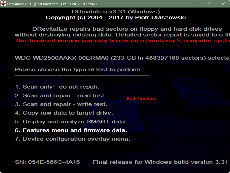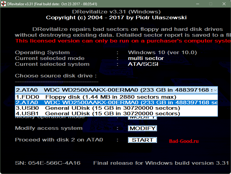 Последняя замеченная версия - 4.10, более удобная. Сайт производителя заблокировал РФ или его заблокировала РФ. Запускалась в портативной WinPE от Стрельца: валидировалась, вводился ключ - готово. Устройства видны в выпадающем списке. При выборе устройства нужно ждать минуту. Выбрать пункт, связанный с прошивкой. Выбрать пункт затирания инфы о BAD-ах.
