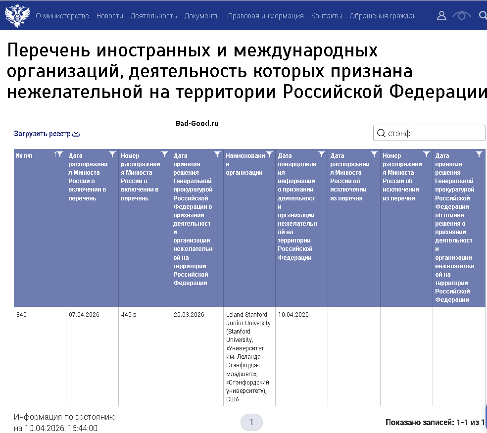 МинЮст внёс Стэнфордский университет в перечень нежелательных организаций.