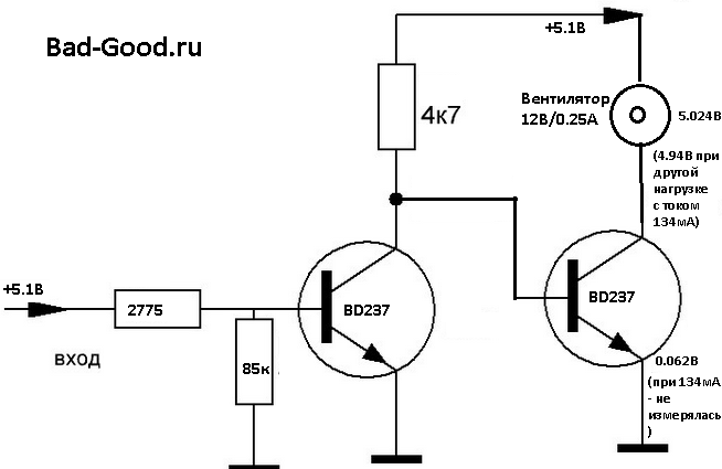 Как была найдена схема. Типично для диванных форумов: ответ жертве-ТС: "попробуй это" - и рисунок схемы идёт. Это как я скажу: "попробуй программируемый автомат"; а если у него стандартное время отсечки при превышении тока не изменить с 1с до 0.1с - всё сгорит на фиг при КЗ. Когда же обугленная жертва предъявит советчику: "какого х*я?" - советчик такой: "ачотакова, яничо, самдурак" - и сваливает в закат. Эта схема - не инвертор сигнала. Это - теория по инвертированию сигнала, причём описанная без нюансов и вообще без текста: - по факту, инвертированный выходной сигнал будет отличаться относительно инвертированного эталонного: по совершенно мизерной силе тока - требуется ещё 1 дополнительный транзистор для усиления тока на нагрузку; - если базу основного транзистора не снабдить подтягивающим резистором на землю: при обрыве сигнала или его отсутствии транзистор может тупо не закрыться и остаться висеть в открытом/приоткрытом состоянии - требуется ещё 1 дополнительный резистор (а какой - зависит от транзистора: для BD237 85кОм хватило - но это не предел); - резистор 4.7кОм на схеме выбран от балды. Им регулируется мощность, рассеиваемая на нём самом при открытом транзисторе - а также ток, который после него становится выходным. Можно и 1кОм поставить для выходного тока 5мА при напряжении 5В - ничего страшного не случится, и мощность выходного сигнала увеличится в >5 раз. Ну а что такое 5мА при 5В - 0.025Вт рассеиваемые. Ну давайте ещё меньше поставим (усиление выходного сигнала в ущерб энергоэффективности - и то ущерб не всегда будет): 200Ом - 0.125Вт (без учёта 0.7В на транзисторе: эксперимент показал, что там гораздо меньше падает, в районе 0.01В - какого х*я?..) - выходной ток 25мА. А вот 25мА - уже без всякого усиления на выходе: на питание микросхем разных хватать будет. А hFE обычных транзисторов - ну пусть мизерный 25 даже - потребуется входной исходный сигнал всего 1мА - да даже датчик Холла столько может выдать при своих жалких 5мА по даташиту. Таким образом: - игры с номиналами резисторов - фактически, оптимизация энергоэффективности схемы (или, наоборот: на хрен энергоэффективность - хотя бы не мизерный сигнал на выходе выдавай); - можно подобрать резистор на питании такой, что вместе с инвертированием сигнала на выходе - произойдёт ещё и его усиление по току; - токоограничивающий резистор на базе транзистора - необходим (иначе сгорит), и должен рассчитываться последним (со спецификой входного сигнала). Я в него тупо 5В тыкал (идеальный источник сигнала без внутреннего сопротивления) - предполагаемый ток база-эмиттер 50мА - ну, это абсолютный перебор, да, - тут и 1кОм подойти должен. Что-то спаял, смакетировал - рабочая схема - начинаем углубление. Транзистор BD237 (вокруг него всё крутится пока): - даже при резисторе 4.7кОм, - открылся до падения 0.008В (далее анализируется этот феномен: 5В воткнуто в резистор базы). 2 раза перемерил - этот феномен совсем неясен: почему NPN сработал как N-канал по степени падения напряжения. Предчувствовал потенциал этого транзистора (выстрелил с hFE >28000 как составной транзистор Дарлингтона) - но чтоб такое. Скорее всего: он включён к земле - hFE не работает должным образом. И, действительно: через него течёт ток база-эмиттер 39.3мА при токе коллектор-эмиттер 1мА; - то есть, на каком-то токе база-эмиттер (условно, >20мА): его текущий hFE позволяет раскрыться ему полностью как N-к